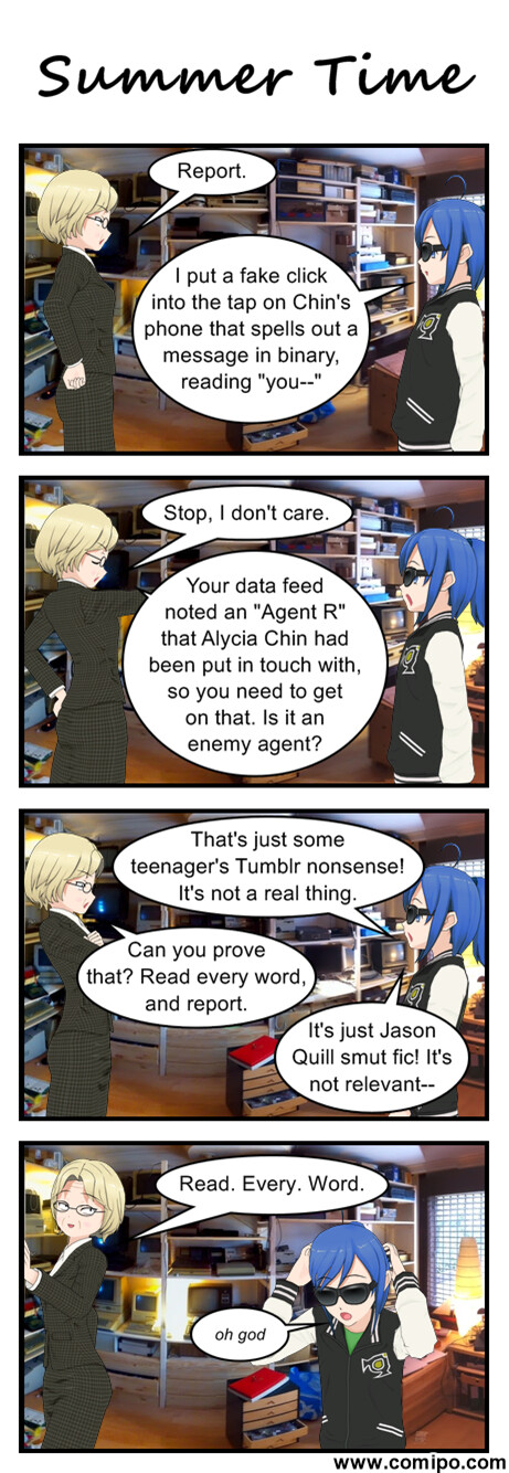 Yeah, Summer’s texting Alycia with that, and the reason is even in the text: “I haven’t read through it all”. She has no idea about “Malice Chance”. Dave can quietly pretend this never happened if it’s too much for Alycia to deal with (I can imagine a gamut of responses, though), but I thought at least us players would be amused at the idea.