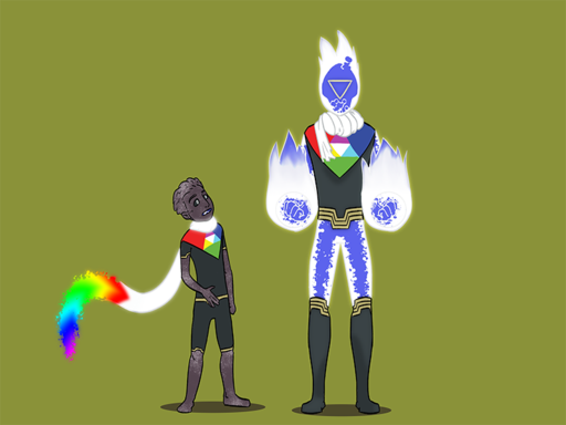 So on the left we have our Concord. Made some subtle changes to my last design based on the image of Sablestar (nothing major, just little bits to make the comparisons more apt). I also remembered that Kirby Krackle was a thing and added a bit into the scarf. Really fits the “sparking” description better now.