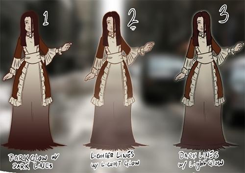 The next thing that I wanted to work but just… didn’t: transparency. Just never looks with complex shapes behind her for the same reason the the smoke dress didn’t. Also makes some odd tangents if there’s something behind her face. A nice compromise is the glow effect (last in the tests), but I think I’ll also wash out the black lines a little (probably the same color as her hair, but we’ll see) so she looks out of place. This is getting filled under “Still in Progress.”
