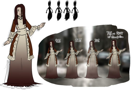 So as much I loved the idea of a skirt made of smoke… I could never get it to look right. It was either overly complex and drew attention or it was just a shapeless blob and looked horrible. Instead, we’re going Morticia Addams here. That’s a maybe keep at this point. It looks okay, it’s easy to draw, and it fits the “undead” theme, but there might be a better idea out there still.