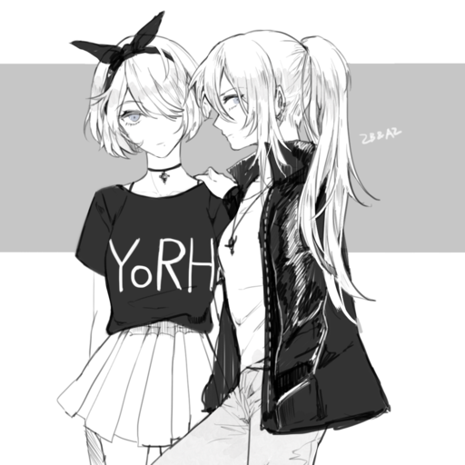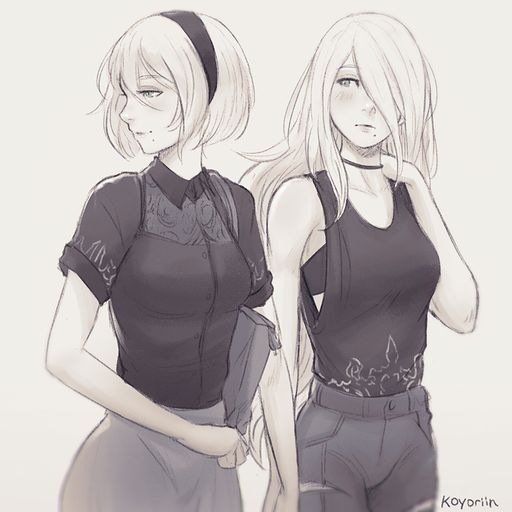 I did some digging for relevant pics for Pneuma/Numina from where I think Mike started. Here’s 2B (short hair, band) and A2 (long hair), the white-haired gynoids of Nier: Automata, outside of their usual (and very distinctive) costumes.