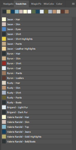 Finally, on a side note that affects all of the pictures I finally did myself a favor and made color pallets for all the characters. Basically it’s saving colors so that I don’t have to go back to another picture and hope the original, pre-shaded/pre-highlights color is still there. They’re super simple to put together and I usually make them if I’m going to draw the same character a lot, but they’re also time consuming (especially if you forget a color and have to re-order them) and I was thinking at the get-go “Oh, we’ll probably play this game for a couple of months like the DW game. I’ll draw like one picture and won’t even worry about how character designs work outside the one-off group picture.” Showed me, didn’t we?