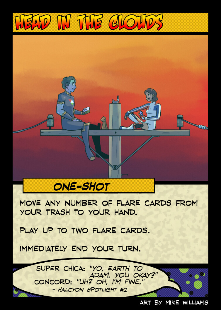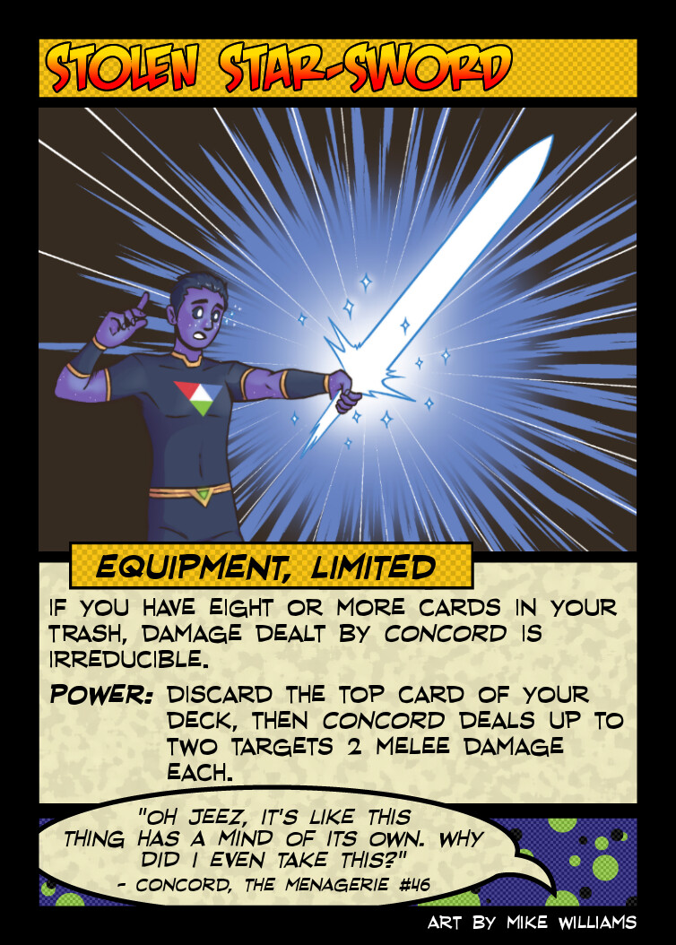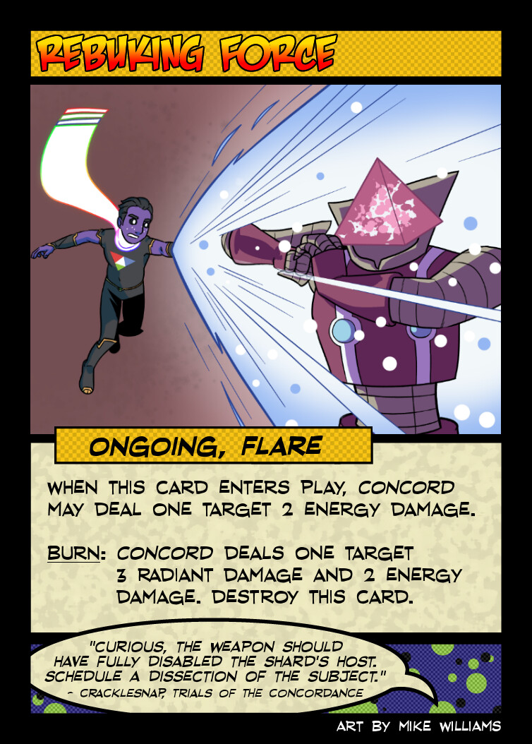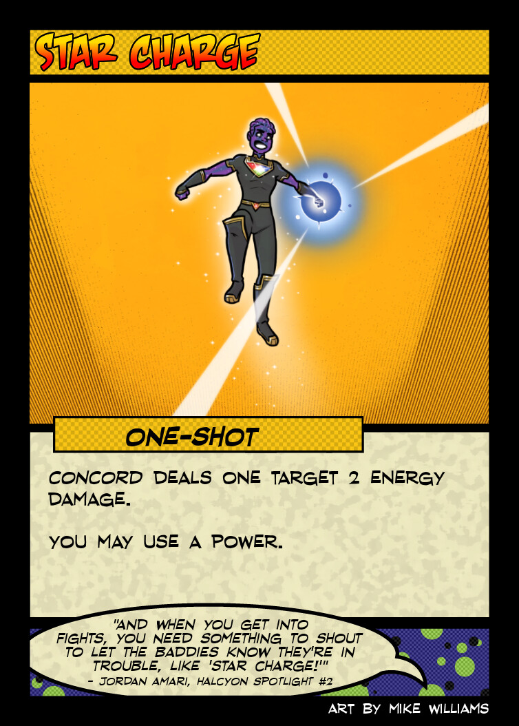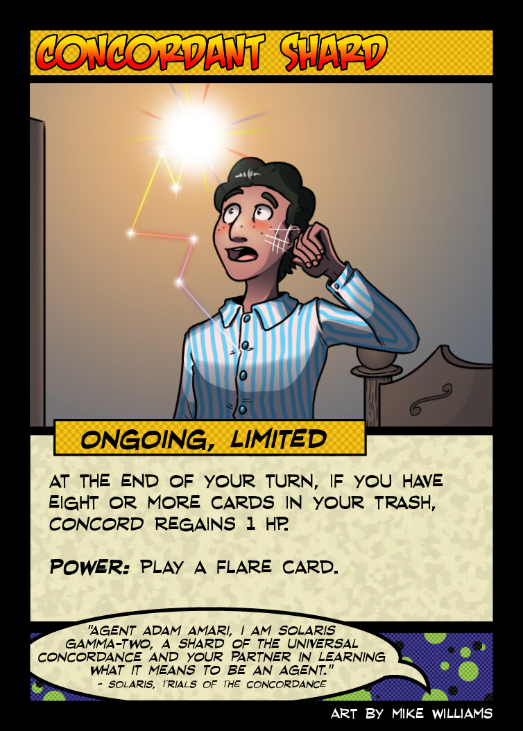 Mechanically, my one disappointment with this card is that it is the only one of Concord’s ongoings that doesn’t care about his trash, things being destroyed, or destroys itself for power, but generally a hero’s “reduce damage taken by 1” card is already among their most powerful, so doesn’t’ really need too much of a bonus to make it worth playing.