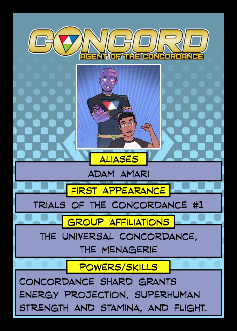 Trials of the Concordance (as referenced in the quote) is something I’ve had milling around in the back of my head for a while. The name has that campy, Silver Age feel that I thought fit Concord well and I knew Concord’s backstory since the Menagerie game: he was empowered by Sol, kidnapped by aliens, and then had to rescue himself when Sol was damaged (an origin that has been referenced during Phase Three), so that became the name of Concord’s origin story.