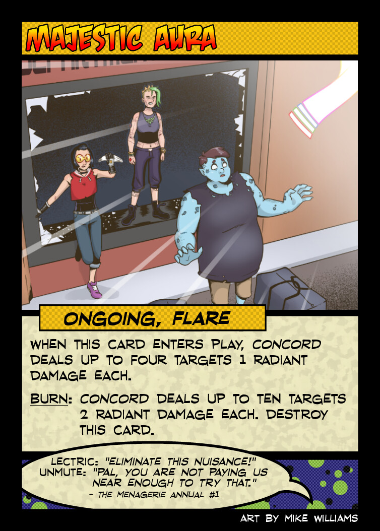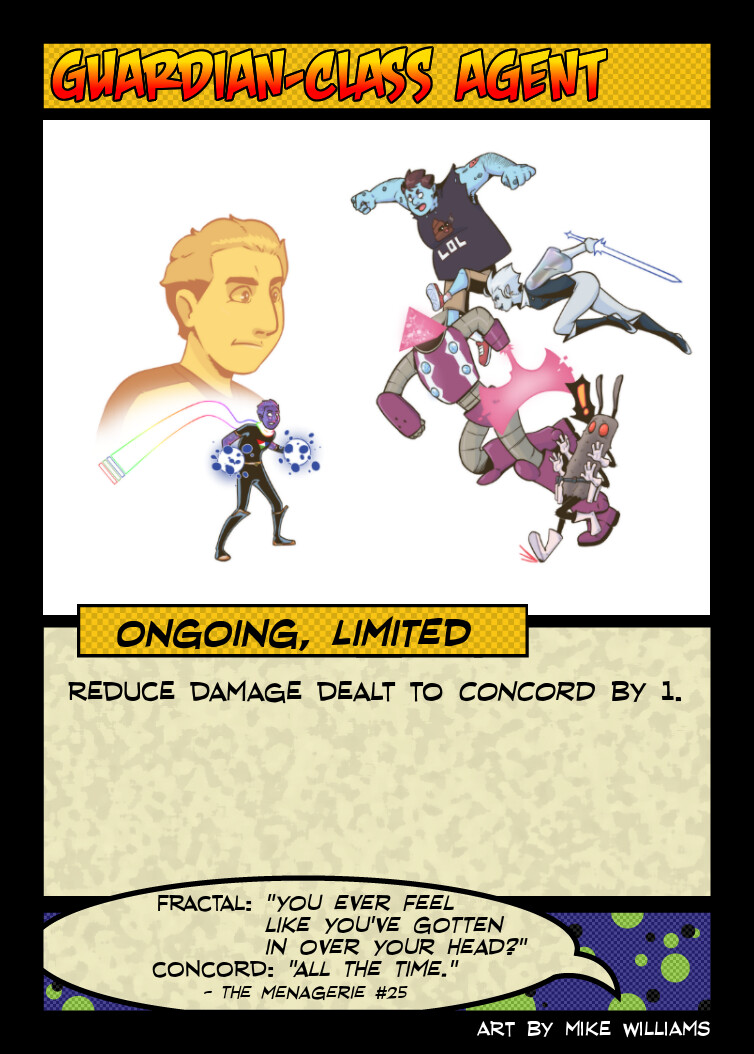 This was the last piece I did for the deck and is the only one where Concord isn’t front and center in the art. Really wanted to highlight the concept that Concord has shown off enough power throughout the series that some of the C-tier baddies are going to react to him showing up as “ah crap” instead of “get him!”