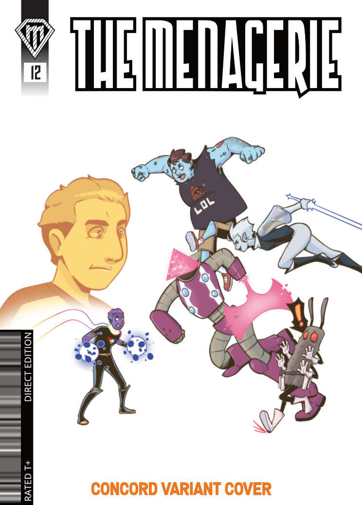 This is one of cases where the quote does not come from where the image did and is more about vibes. I attributed the art to Issue 12 (which would presumably be the issue that caps off the end of the first year of Menagerie comics) and so the art is Concord facing down each foe he faced in the previous issues (in clockwise order starting at the top: Ego Trip in Issues 1-3, Ambra Nerach in Issues 10-11, Space Bug in Issue 9, and Grand Cataloguer Cracklesnap from Trials of the Concordance). I could have included one of Netherwarden’s ghosts too, but I felt those would go better on a Charlotte-focused version of the cover.