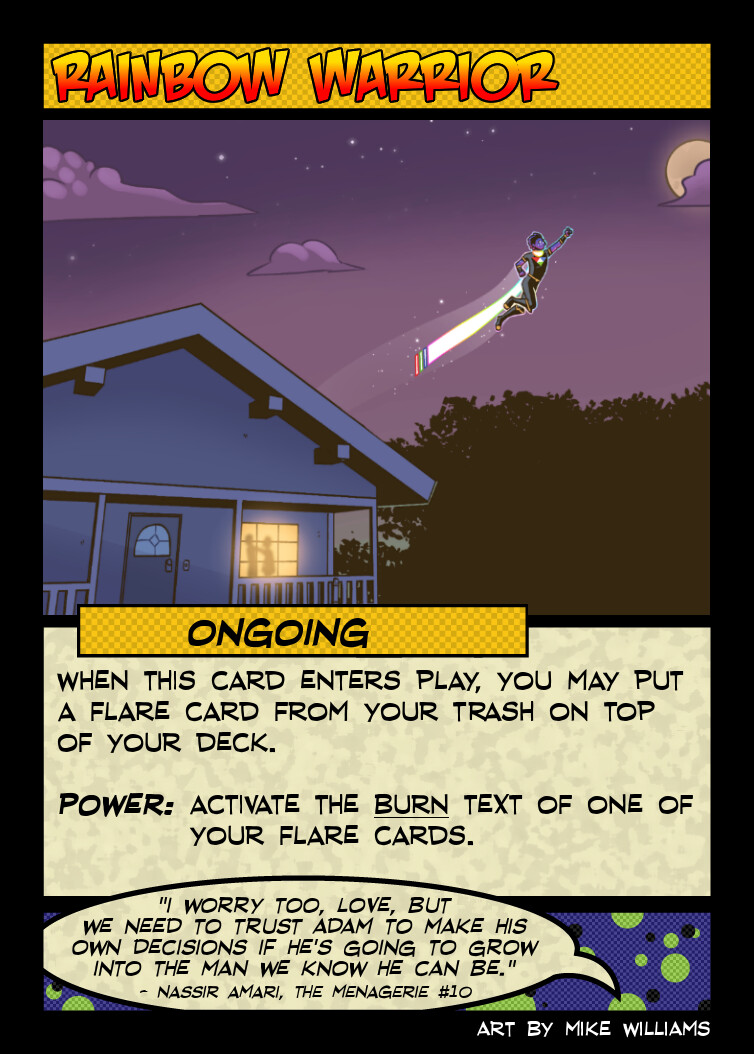 We also get our first quote from one of the Rainbow Warriors, Agent Honesty. They originally made an appearance elsewhere in Concord’s deck, but was retrofitted here when that card’s art changed. This also lets us reference some of Concord’s storyline and Sol’s doomed by the narrative nature.