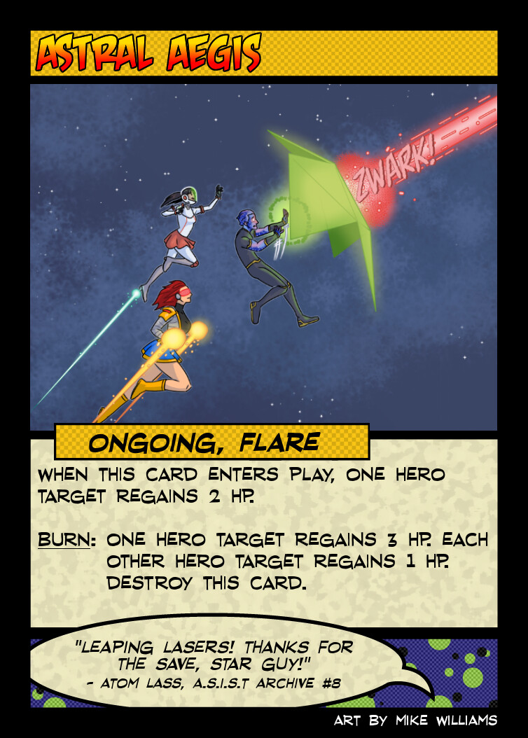 Mechanics-wise, you might be asking “why does this card that looks like a shield heal instead of blocking damage?” and that is a very good question with a very simple answer: tracking one-off damage reduction sucks. In fact, tracking any effect that doesn’t have a card that’s going to stick around on the table kind of sucks, but at least with damage bonuses they’re likely to be used during your next turn. Reducing the next damage dealt to a specific hero may stick around for several rounds (an issue that frequently occurs with Charade’s deck) so I wanted to avoid it going forward. It may not be a perfect ludic fit to what’s happening, but HP is already something you’re tracking and it feels a lot better in practice.