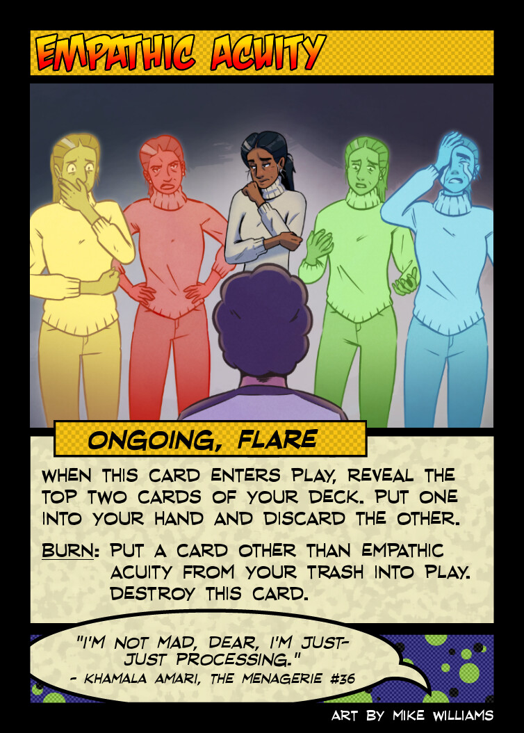 This is also the last Burn enabler and usually not one you want to use as one, but sometimes you just need a way to start the cascade of Burns going (frequently by using Empathic Acuity to bring something that got binned from one of your powers back into play).