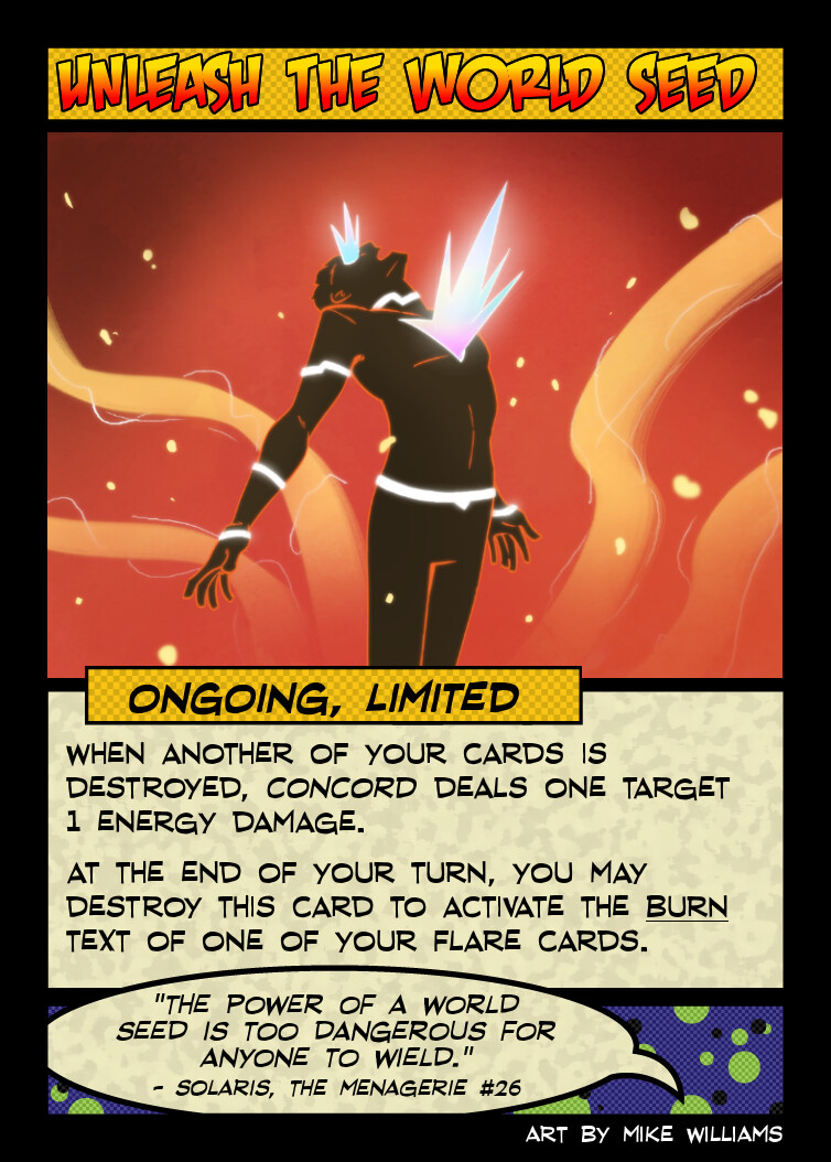 The art for this one was decided because I wanted to represent Concord in his Keynome/World Seed empowered state (a future variant character card for Concord!) at least once so folks weren’t surprised by that look.