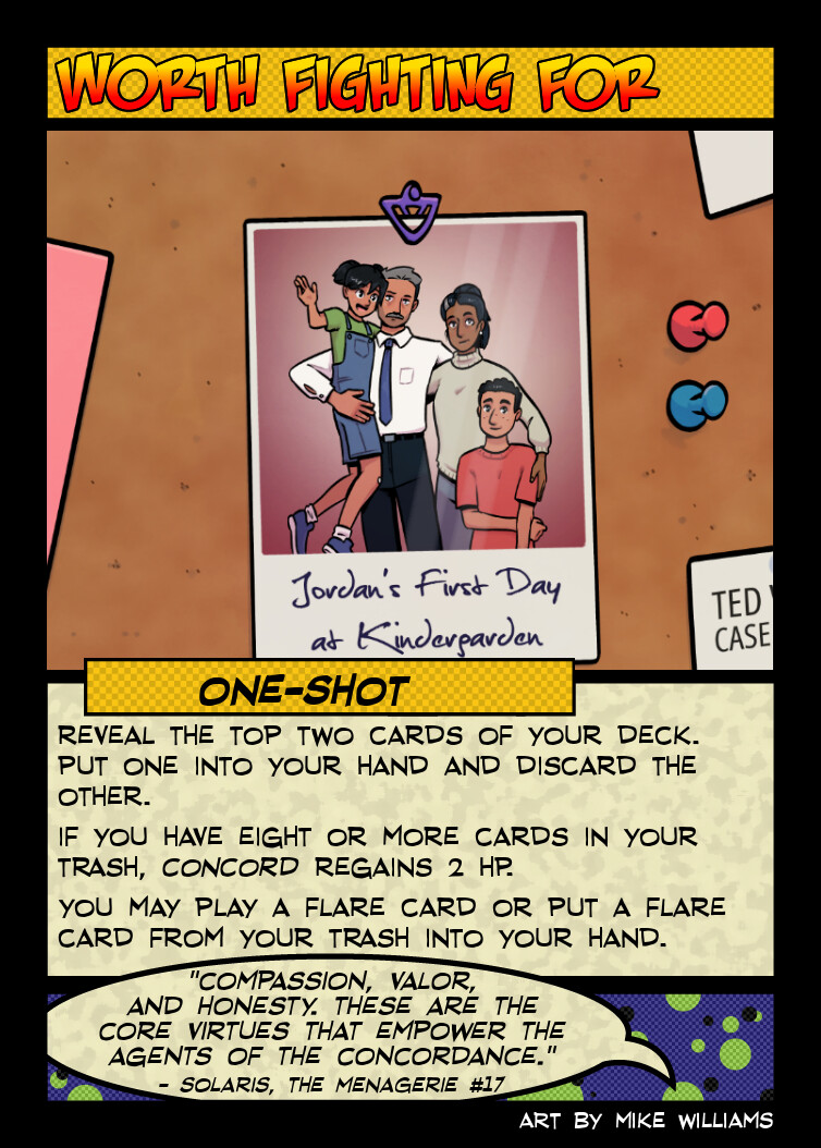 As I’ve grown as a game designer, I’ve learned a value of having a single card that explains exactly what a deck wants to do to serve as a baseline. For instance, Charade’s Legacy of Terror can (if you’re playing with Charade’s base character card) tuck a card under your character card and immediately get its bonus effect from using her base power or set up for later, showing her ideal play pattern to someone just playing her deck. Worth Fighting For is that for Concord: throw stuff in the trash, get bonuses for having things in the trash, and play Flare cards.