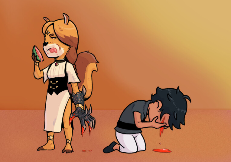 A merchant in a bloody heap on the ground, as a squirrelkin. Who then acts meanly.