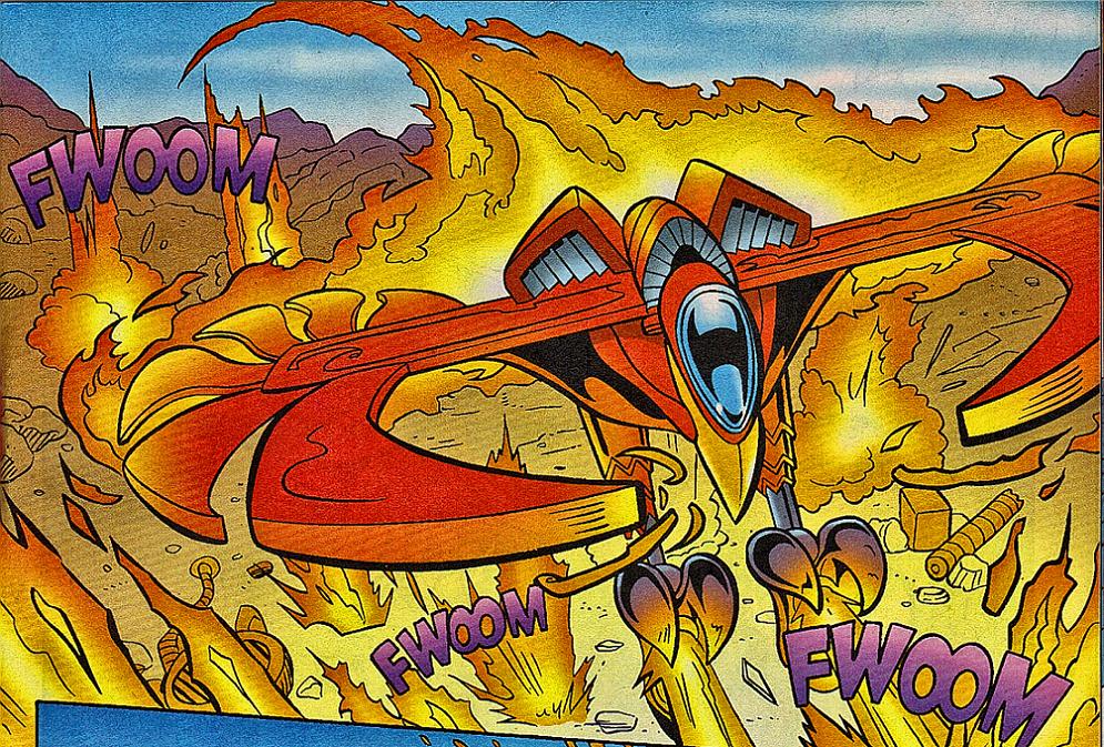 (Someone is looking out a window. “Send in security.”) Various bot minions swarm ad attack. Leo hops back into cockpit, and Phoenix turns into bird.