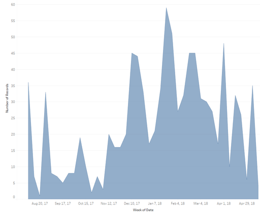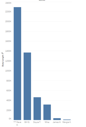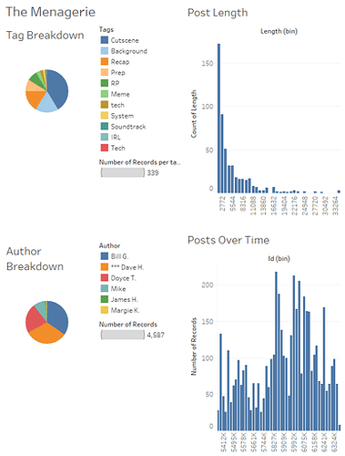 I finally added a thing to parse dates on individual posts, and once again Tableau’s power to snap visualize data helps me out. This is all “substantial” posts (defined as having 1024 characters or more), graphed over time by week. This isn’t a bad proxy for activity/interest, and read that way it looks like we’re humming steadily along. There was obviously a lot of shenanigans in the December-January timeframe. The recent peaks and valleys are probably cliff-hanger weeks where there’s not much to do.
