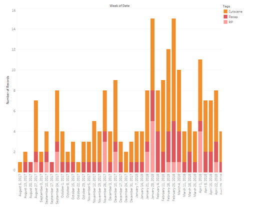 The spike in recap posts probably corresponds to when Dave started writing the IC recaps for Jason and Alycia. We’ve also had a low but steady rate of RP sessions.