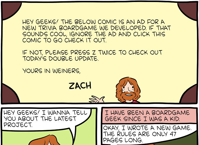 Zack Wienersmith of Saturday Morning Breakfast Cereal is kickstarting a trivia game. This frame sold me: