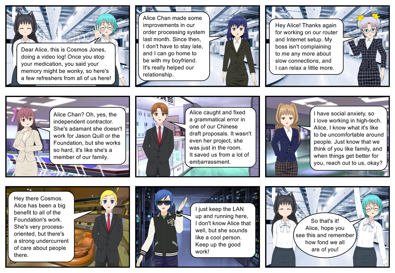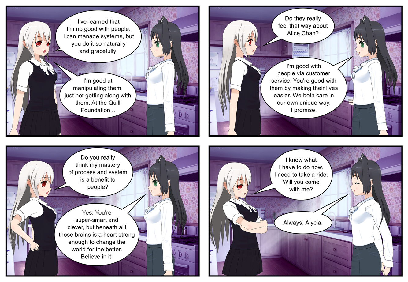 - Just what is Alycia’s relationship to the Quill Foundation? As written here, she’s striking a balance - not working for Jason as a subordinate, to avoid complicating the relationship, but willing to take on specific tasks as an independent contractor. Practically speaking she’s a floating troubleshooter and does what she wants, but uses her contracts to stay safe from meddling.